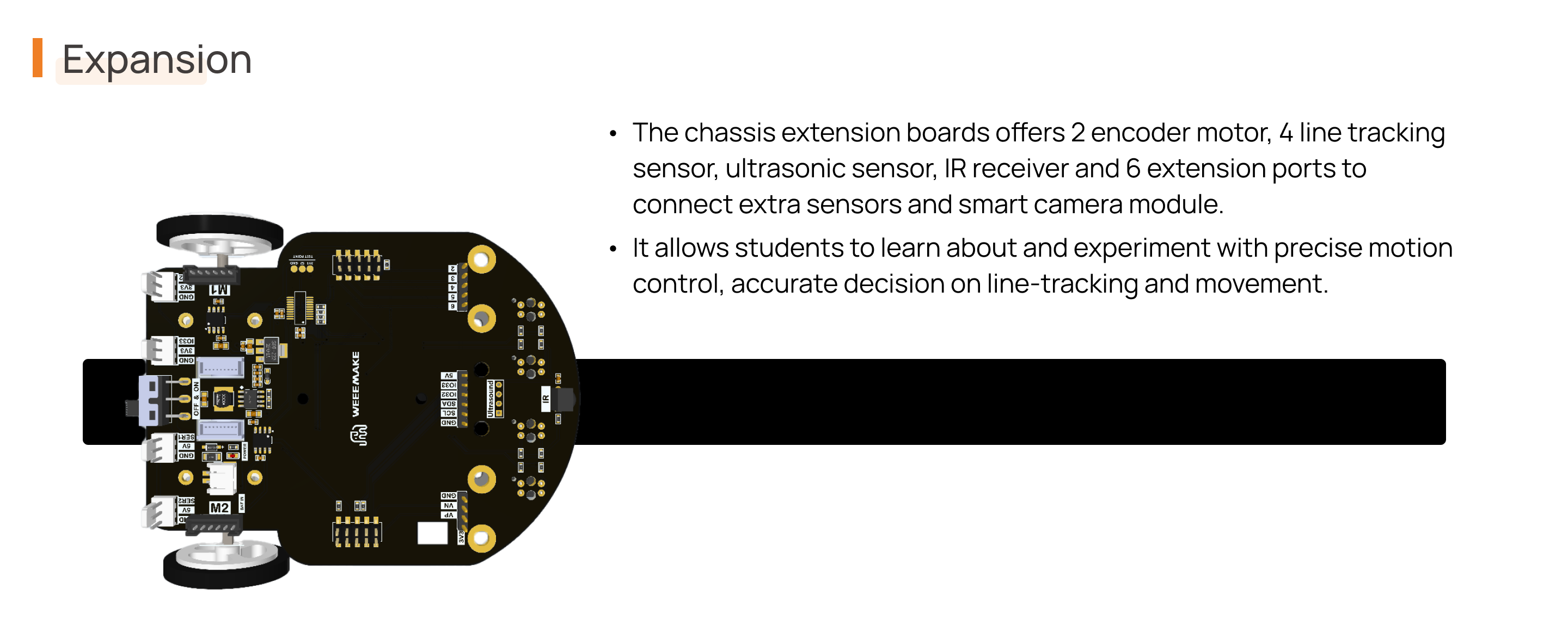 Additionally, WeeeCore has two extension ports that enable you to connect to an extension chassis board and open-source electronic modules. A Type C port allows for power supply and communication with PCs. Five LEDs provide abundant light effects, and a colorful LCD display, onboard microphone, and speaker facilitate audio-video interaction in STEAM education.